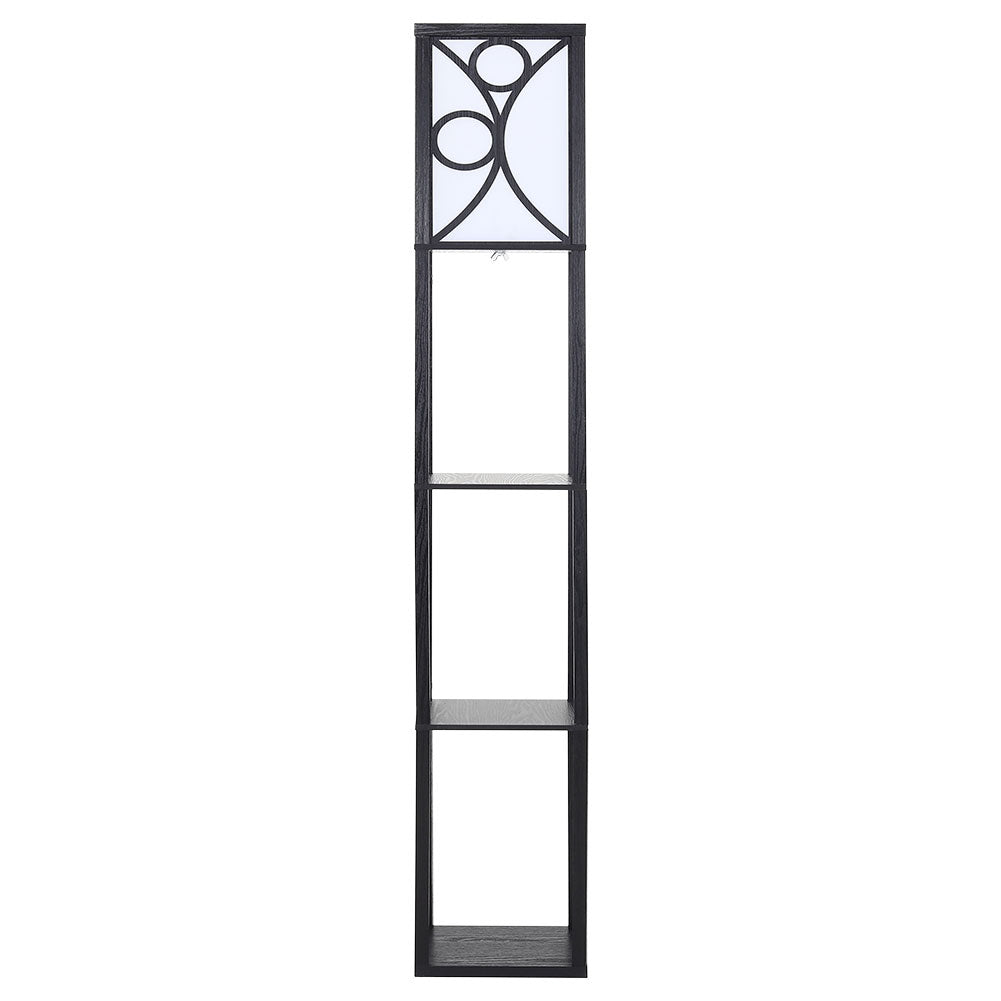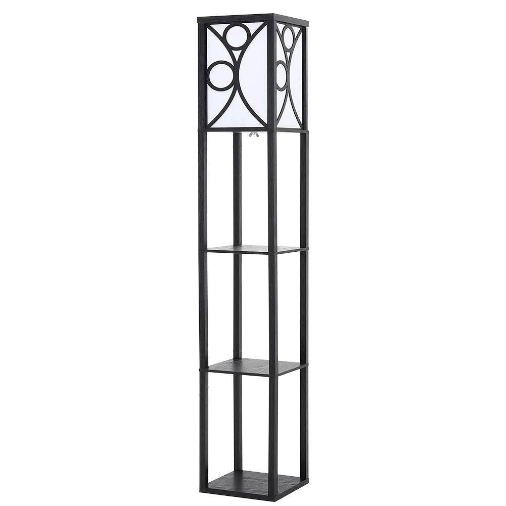 3 in 1 Wooden and Linen Floor Lamp with Shelves,Black Geometric Pattern