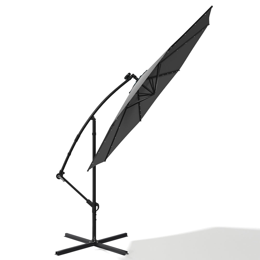 3M Large Garden Hanging LED Parasol Cantilever Sun Shade Banana Umbrella with Cross Base, Dark Grey