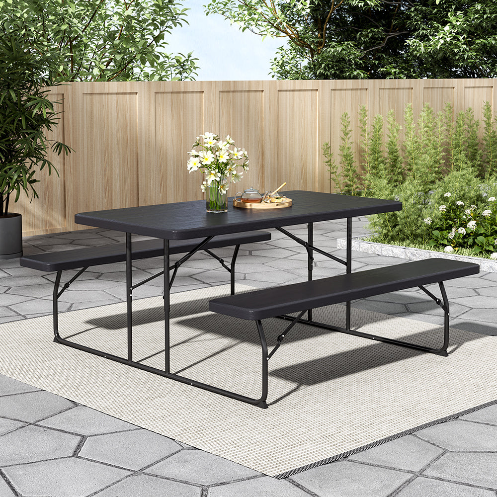 Foldable Black Bench and Picnic Table Set with Parasol Hole