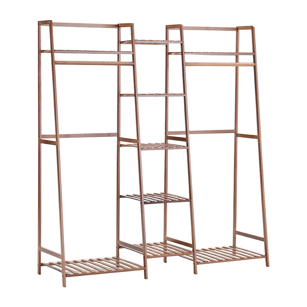 Brown Bamboo Trapezoid Clothing Hanging Rack with Storage Shelves
